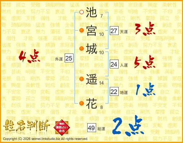 池(7画)宮(10画)城(10画) 遥(14画)花(8画)