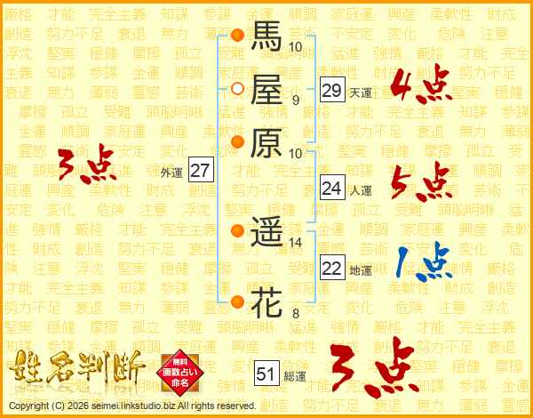 馬(10画)屋(9画)原(10画) 遥(14画)花(8画)