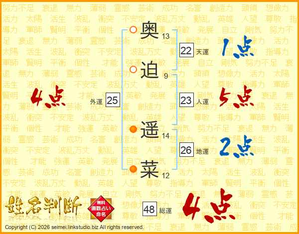 奥(13画)迫(9画) 遥(14画)菜(12画)