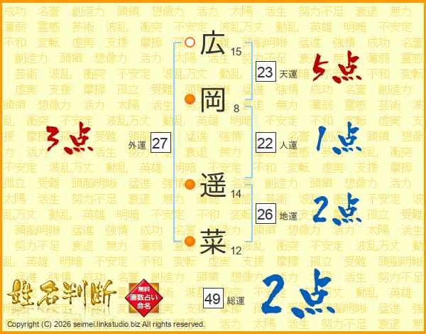 広(15画)岡(8画) 遥(14画)菜(12画)
