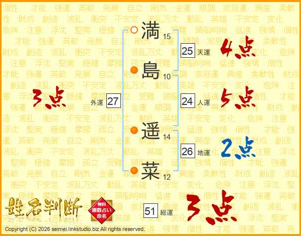 満(15画)島(10画) 遥(14画)菜(12画)
