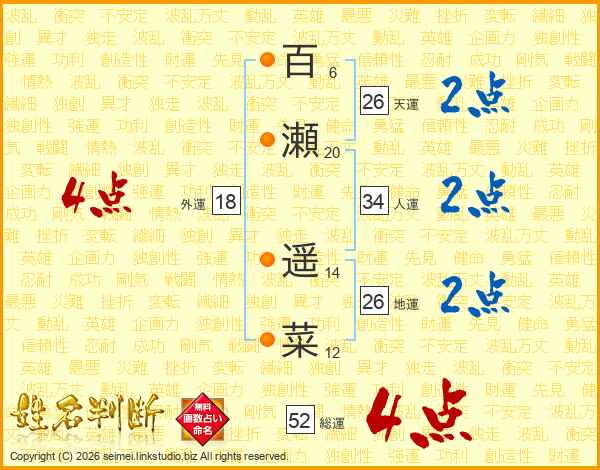 百瀬遥菜さんの天運は26画の2点!