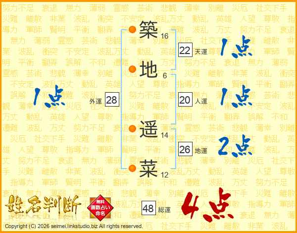 築(16画)地(6画) 遥(14画)菜(12画)