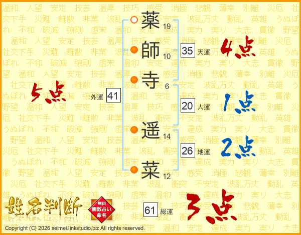 薬(19画)師(10画)寺(6画) 遥(14画)菜(12画)