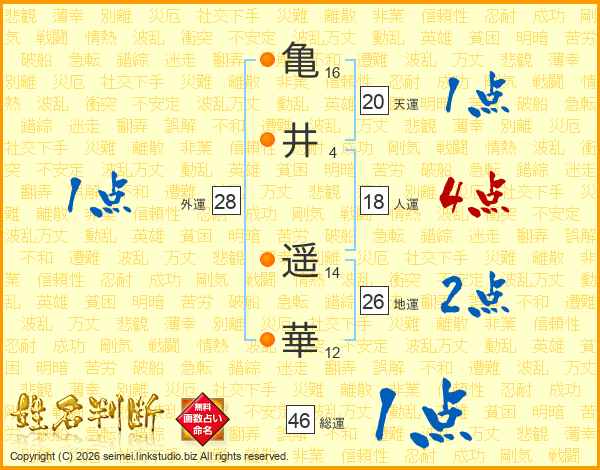 亀(16画)井(4画) 遥(14画)華(12画)