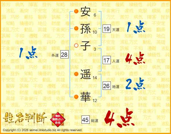 安(6画)孫(10画)子(3画) 遥(14画)華(12画)