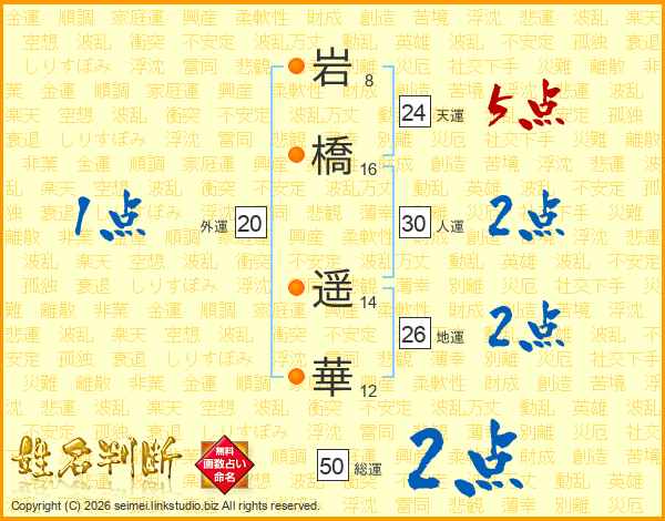 岩(8画)橋(16画) 遥(14画)華(12画)