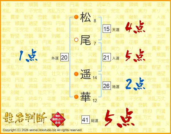 松(8画)尾(7画) 遥(14画)華(12画)