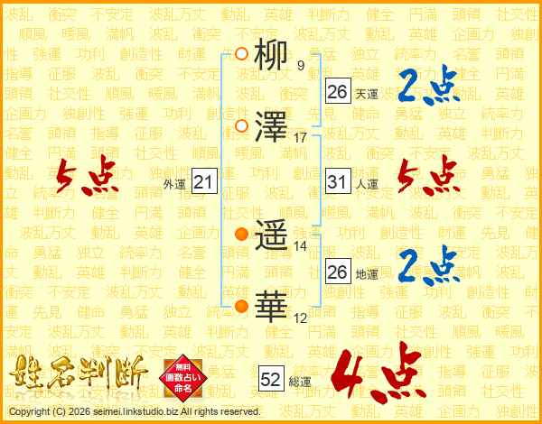 柳澤遥華さんの総運は52画の4点!