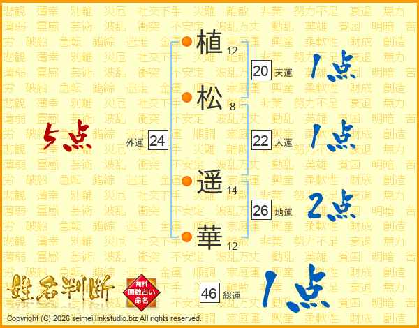 生活面を象徴する運勢です。外部から受ける影響力を表し、結婚運、家庭運や職場、環境への順応性を表します。総運から人運を引いた画数。姓や名が1文字の場合を除く。