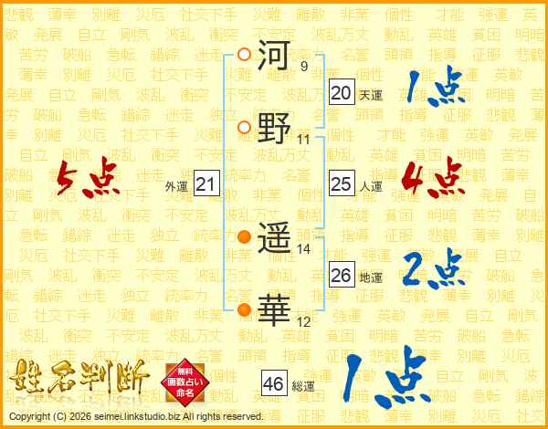 河(9画)野(11画) 遥(14画)華(12画)