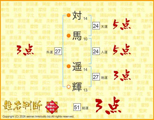 対(14画)馬(10画) 遥(14画)輝(13画)