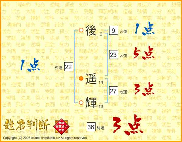 生活面を象徴する運勢です。外部から受ける影響力を表し、結婚運、家庭運や職場、環境への順応性を表します。総運から人運を引いた画数。姓や名が1文字の場合を除く。