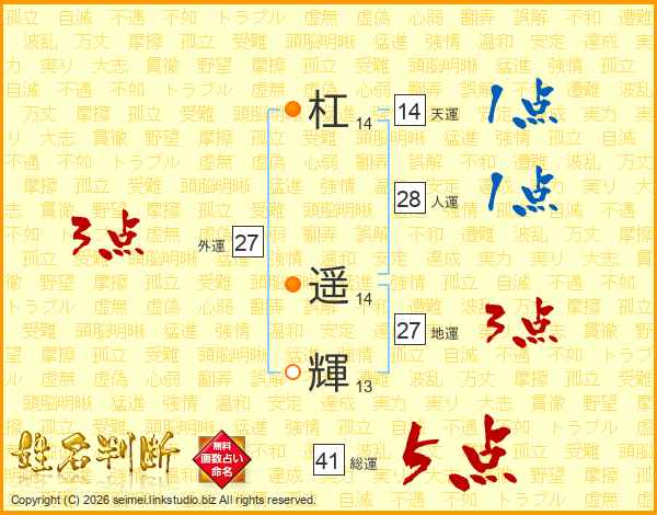 生活面を象徴する運勢です。外部から受ける影響力を表し、結婚運、家庭運や職場、環境への順応性を表します。総運から人運を引いた画数。姓や名が1文字の場合を除く。