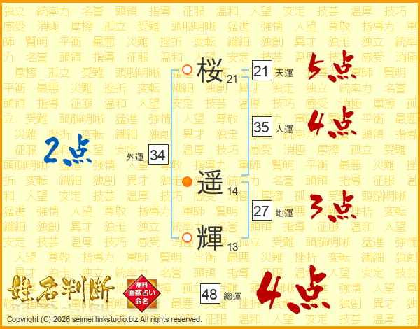 生活面を象徴する運勢です。外部から受ける影響力を表し、結婚運、家庭運や職場、環境への順応性を表します。総運から人運を引いた画数。姓や名が1文字の場合を除く。