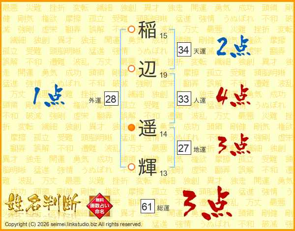 稲(15画)辺(19画) 遥(14画)輝(13画)