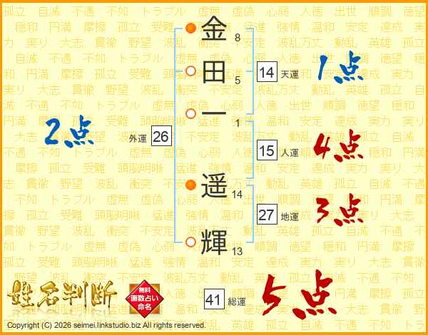 金(8画)田(5画)一(1画) 遥(14画)輝(13画)