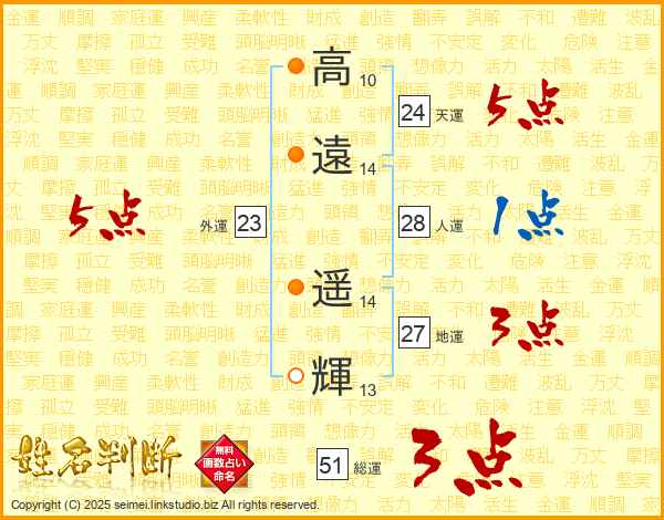 高(10画)遠(14画) 遥(14画)輝(13画)