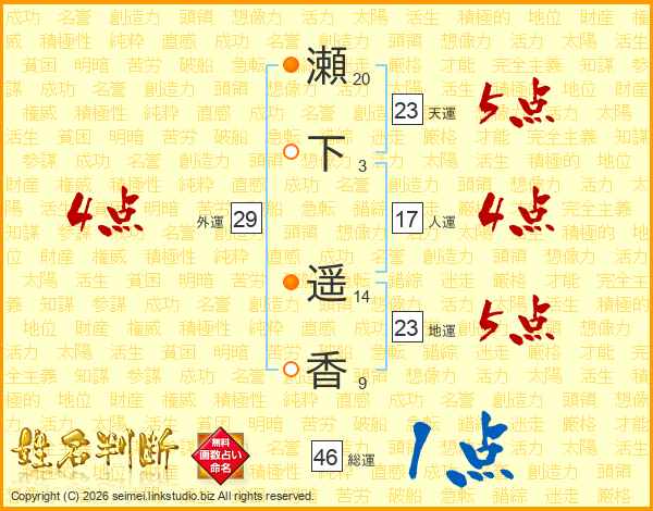 瀬(20画)下(3画) 遥(14画)香(9画)