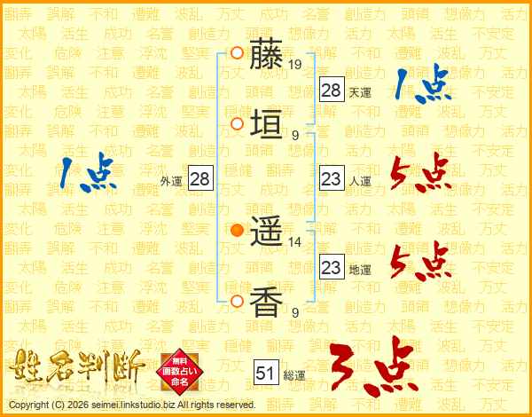 藤(19画)垣(9画) 遥(14画)香(9画)