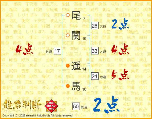 尾(7画)関(19画) 遥(14画)馬(10画)