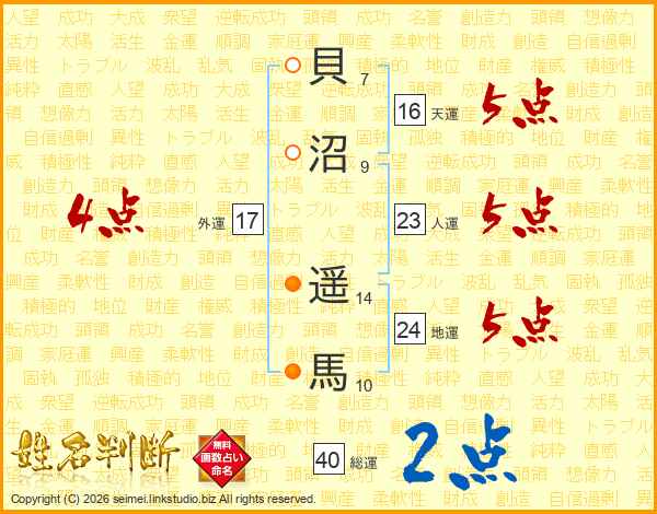 貝(7画)沼(9画) 遥(14画)馬(10画)