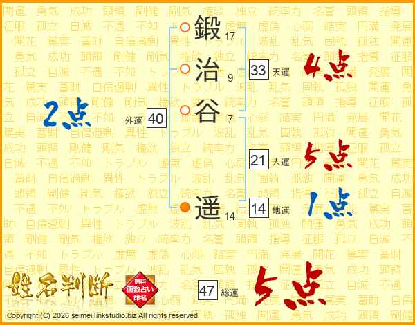 鍛(17画)治(9画)谷(7画) 遥(14画)