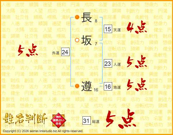 あなたの人生を表す1番重要な運勢です。生涯を通じて影響する総合運となり、主に50歳以降の晩年期に影響を及ぼします。苗字と名前の合計画数。