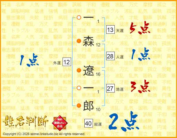 一(1画)森(12画) 遼(16画)一(1画)郎(10画)