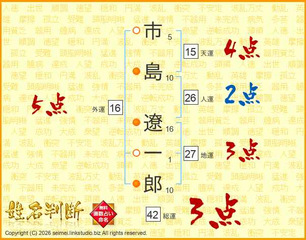 市(5画)島(10画) 遼(16画)一(1画)郎(10画)