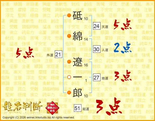 砥綿遼一郎さんの総運は51画の3点!