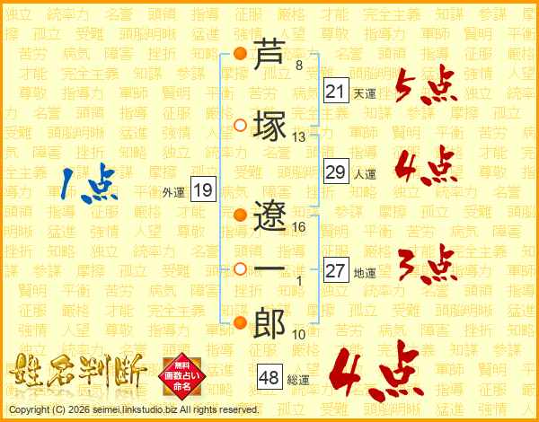 芦(8画)塚(13画) 遼(16画)一(1画)郎(10画)