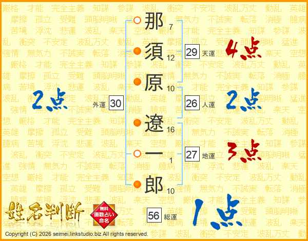 那(7画)須(12画)原(10画) 遼(16画)一(1画)郎(10画)