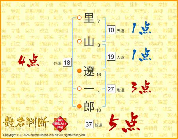 里(7画)山(3画) 遼(16画)一(1画)郎(10画)