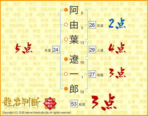 阿由葉遼一郎さんの総運は53画の3点!