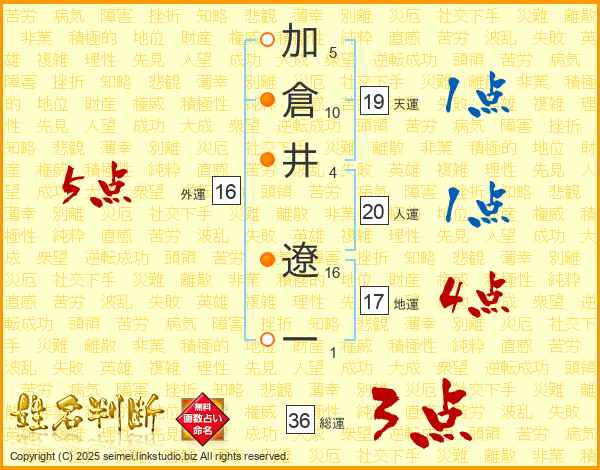 加倉井遼一さんの総運は36画の3点!