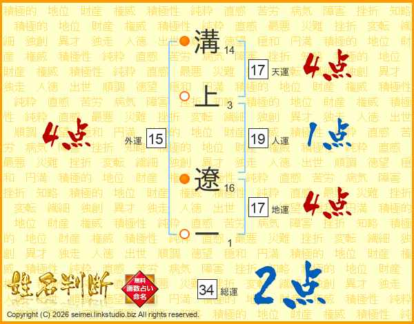 生活面を象徴する運勢です。外部から受ける影響力を表し、結婚運、家庭運や職場、環境への順応性を表します。総運から人運を引いた画数。姓や名が1文字の場合を除く。