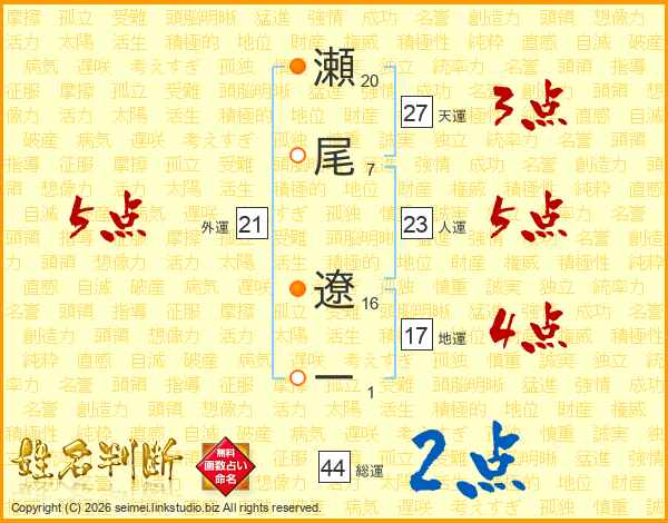 瀬尾遼一さんの人運は23画の5点!