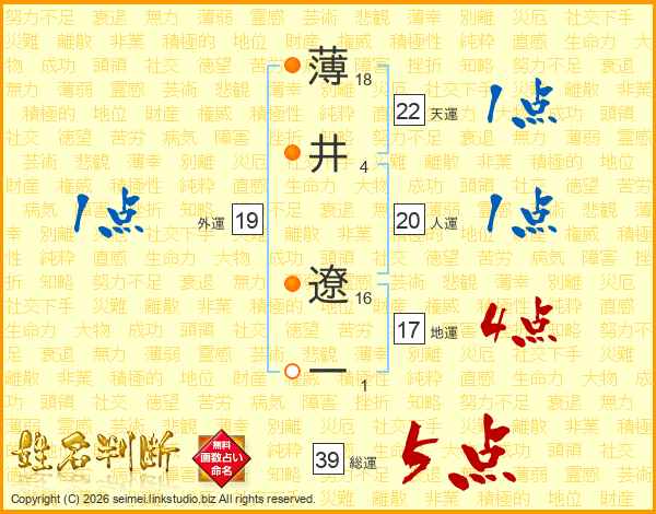 生活面を象徴する運勢です。外部から受ける影響力を表し、結婚運、家庭運や職場、環境への順応性を表します。総運から人運を引いた画数。姓や名が1文字の場合を除く。