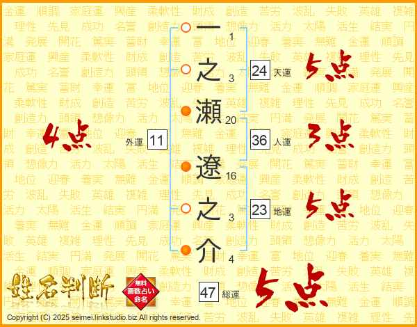 一(1画)之(3画)瀬(20画) 遼(16画)之(3画)介(4画)