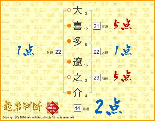 大(3画)喜(12画)多(6画) 遼(16画)之(3画)介(4画)