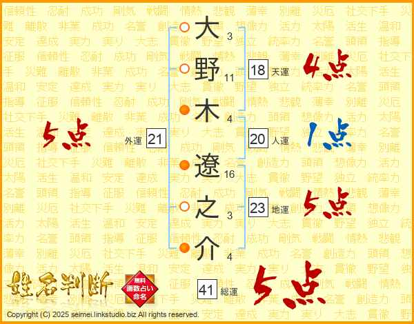 大(3画)野(11画)木(4画) 遼(16画)之(3画)介(4画)