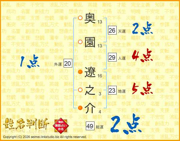 奥(13画)園(13画) 遼(16画)之(3画)介(4画)