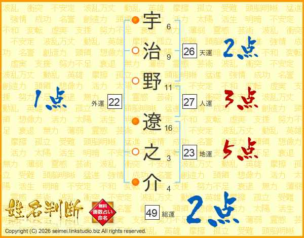 宇(6画)治(9画)野(11画) 遼(16画)之(3画)介(4画)