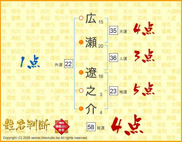 広(15画)瀬(20画) 遼(16画)之(3画)介(4画)
