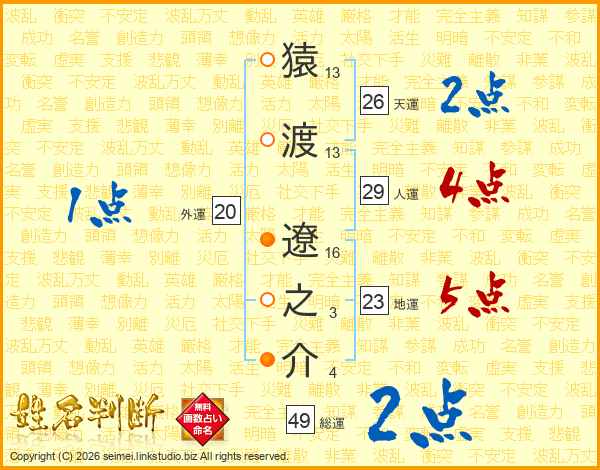 猿(13画)渡(13画) 遼(16画)之(3画)介(4画)