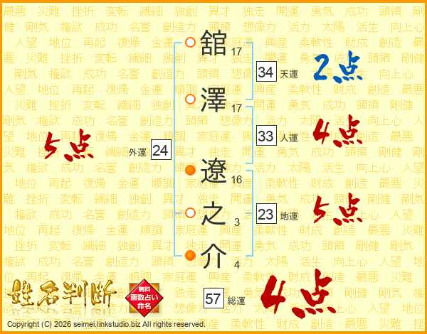 舘(17画)澤(17画) 遼(16画)之(3画)介(4画)