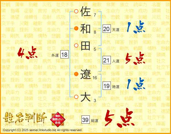 佐(7画)和(8画)田(5画) 遼(16画)大(3画)