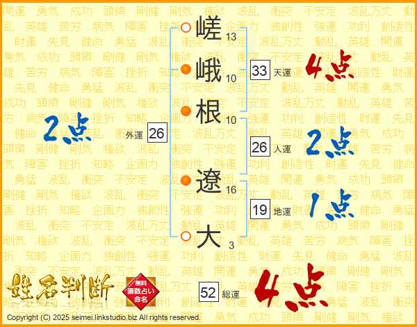 嵯(13画)峨(10画)根(10画) 遼(16画)大(3画)