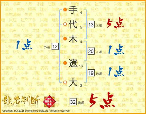 手(4画)代(5画)木(4画) 遼(16画)大(3画)